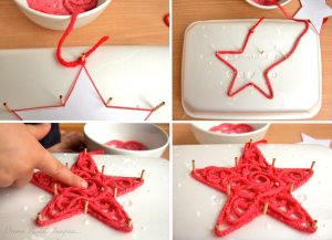 Ennek a csillagnak az alapanyaga fonal. Az elkészítéshez szükséged lesz egy hungarocell lapra vagy hungarocell tálcára, fogpiszkálóra és vizes alapú ragasztóra. Vízzel oldd fel a ragasztót egy tálkában. Rajzolj sablon segítségével csillagot a hungarocell tálcára. A csillag szögeinél szúrj fogpiszkálókat a tálcába.