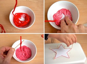 Mártsd a ragasztós tálba a fonalat, és az egyik fogpiszkálóra csomózd fel, majd a fogpiszkálók mentén készítsd el a csillag kontúrját. Nem árt a végén is csomóval rögzíteni a fonalat. Ezután töltsd ki a ragasztós fonállal a csillagot, szép, kacskaringós vonalakkal. Időnként nyomkodd le a fonalat, hogy sima felületet kapj.