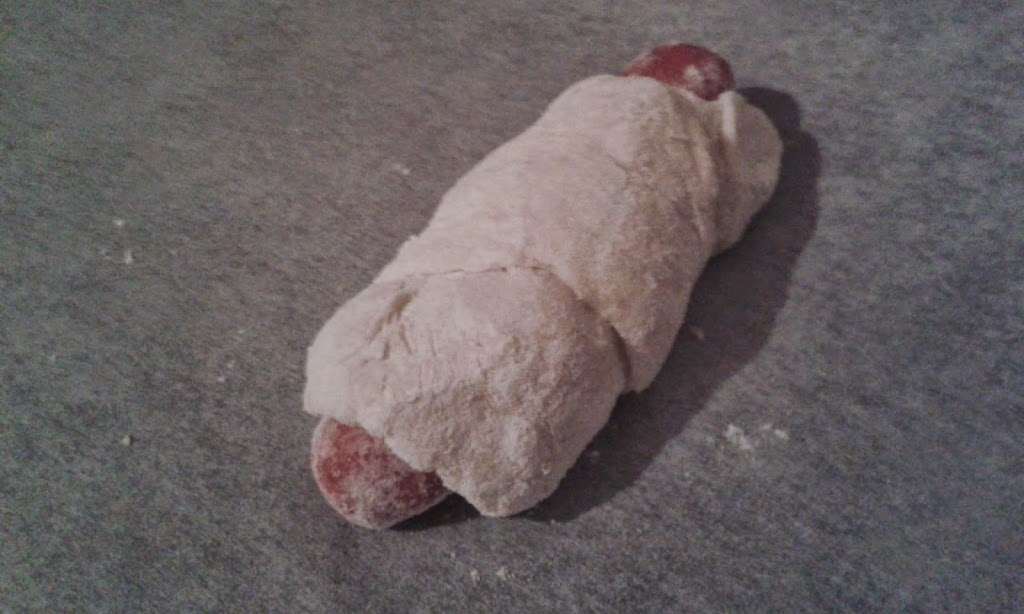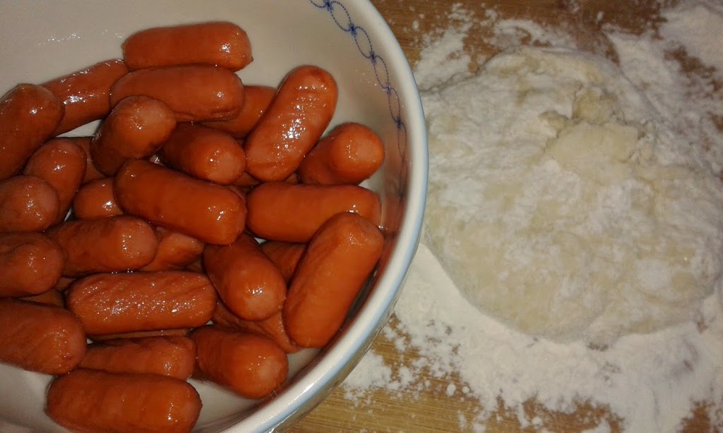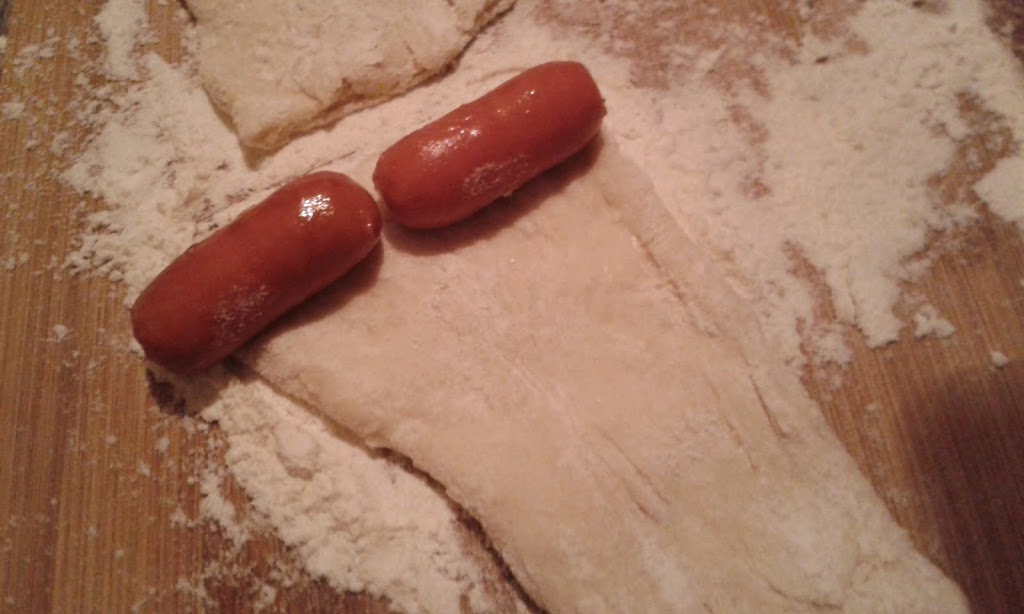 A lisztes deszkán kinyújtott tésztát vágd csíkokra, és csavard föl virslivel.