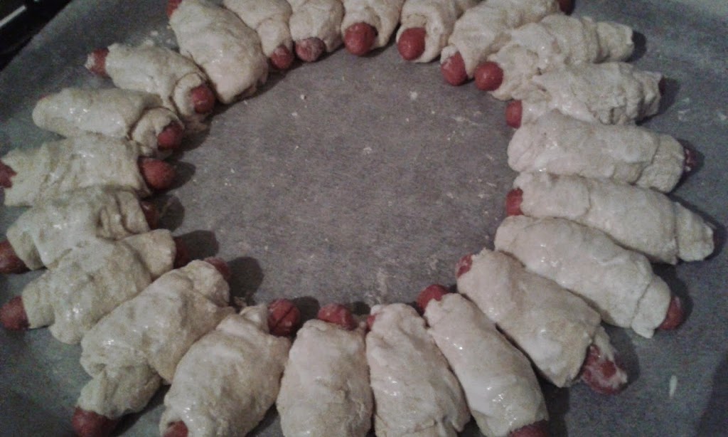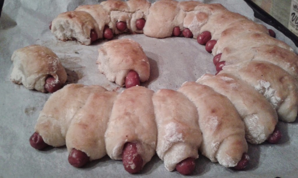 A virslis tésztákat koszorú formában pakold a tepsire.