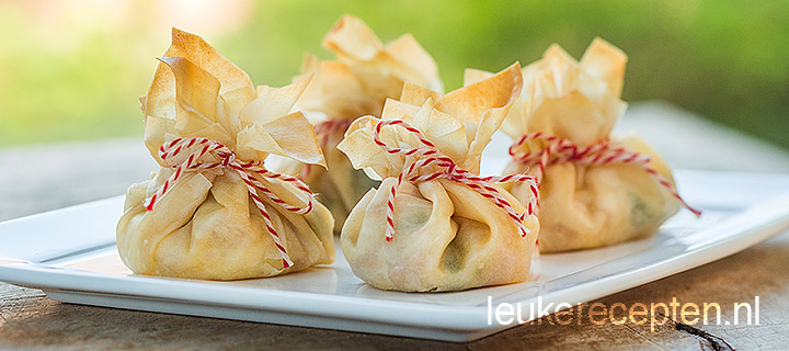 Hajtogasd a tészta sarkait fölfelé. Óvatosan fogd, nyomkodd össze a batyu tetejét. Kösd össze olyan madzaggal, ami jól is mutat, el sem olvad, és semmi egészségkárosítót nem ad ki magából.